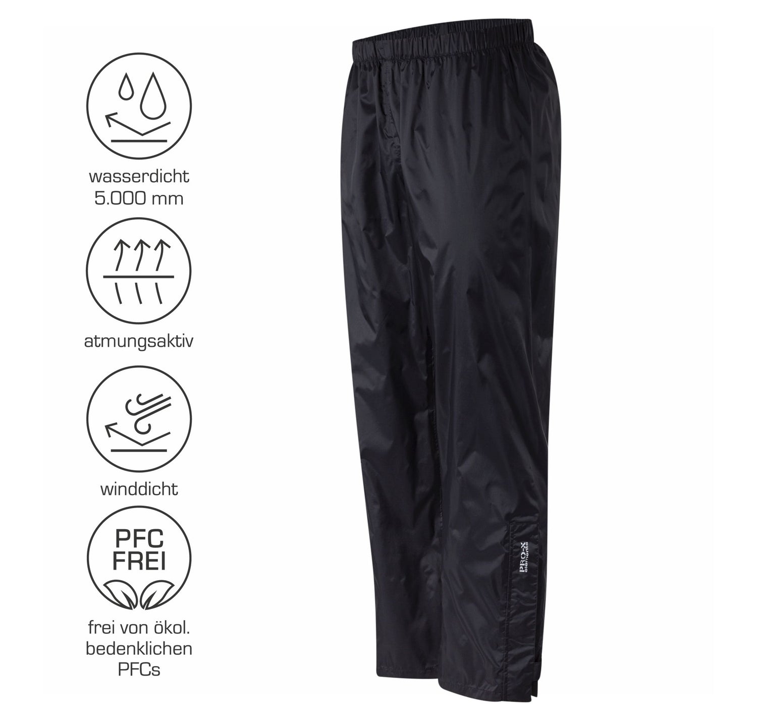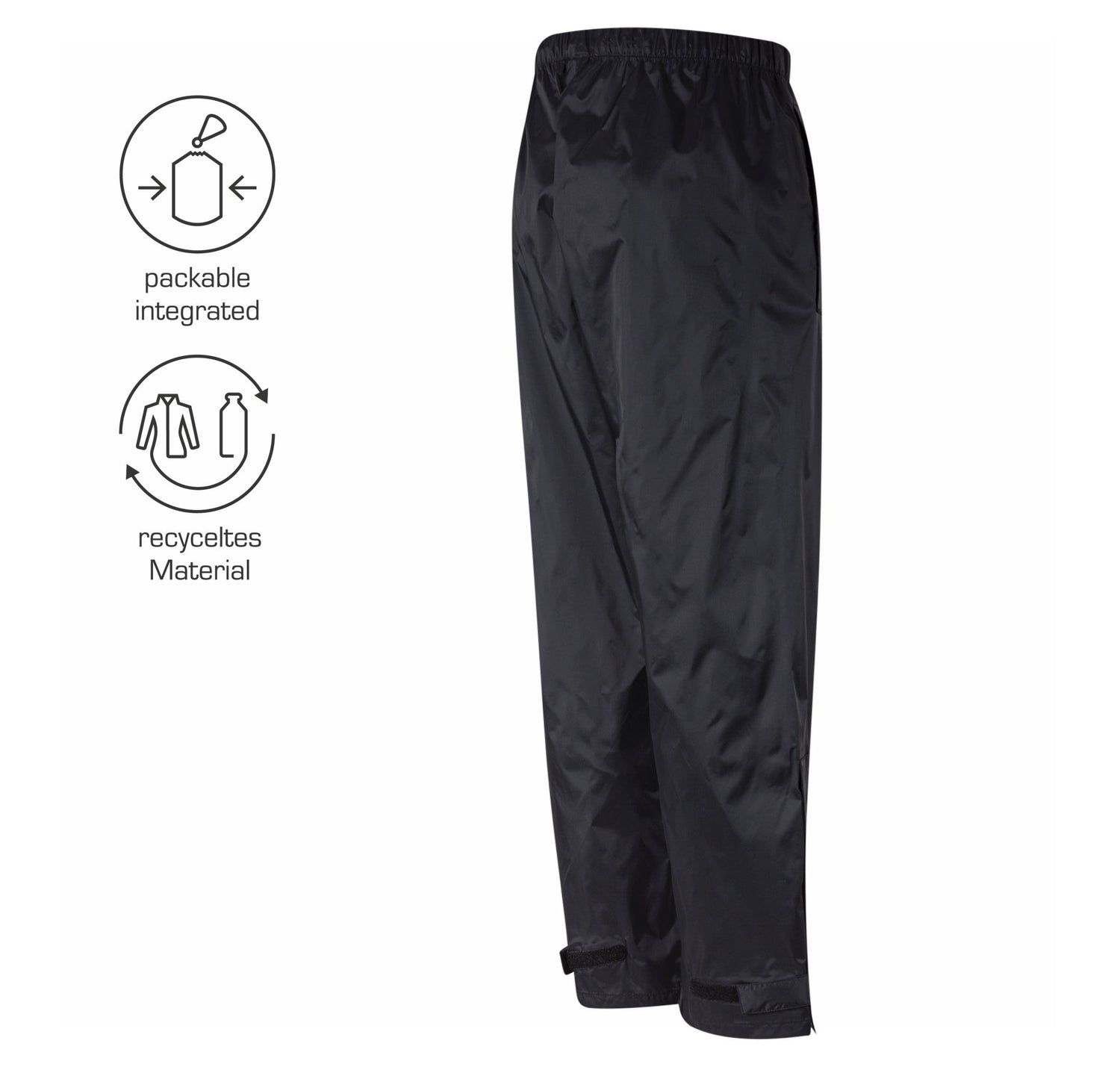 Atmungsaktive Überhose aus PRO5000 mit knielangen, verdeckten Bein-RV’s. 1 RV-Seitentasche mit integrierter Packtasche. Gummizug im Bund. Beinabschluss mit Klettverschlüssen. Die Hosenbeine lassen sich leicht um bis zu 4 cm kürzen. Gewicht in Gr. 38 = 200 g.
