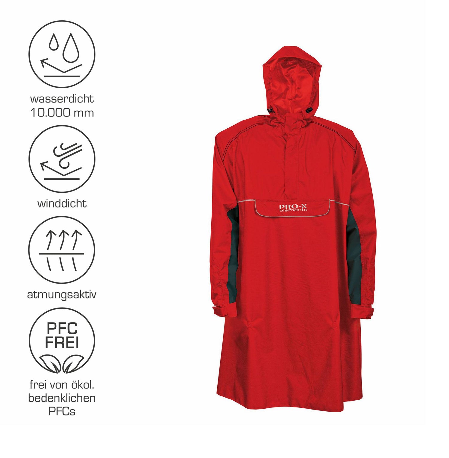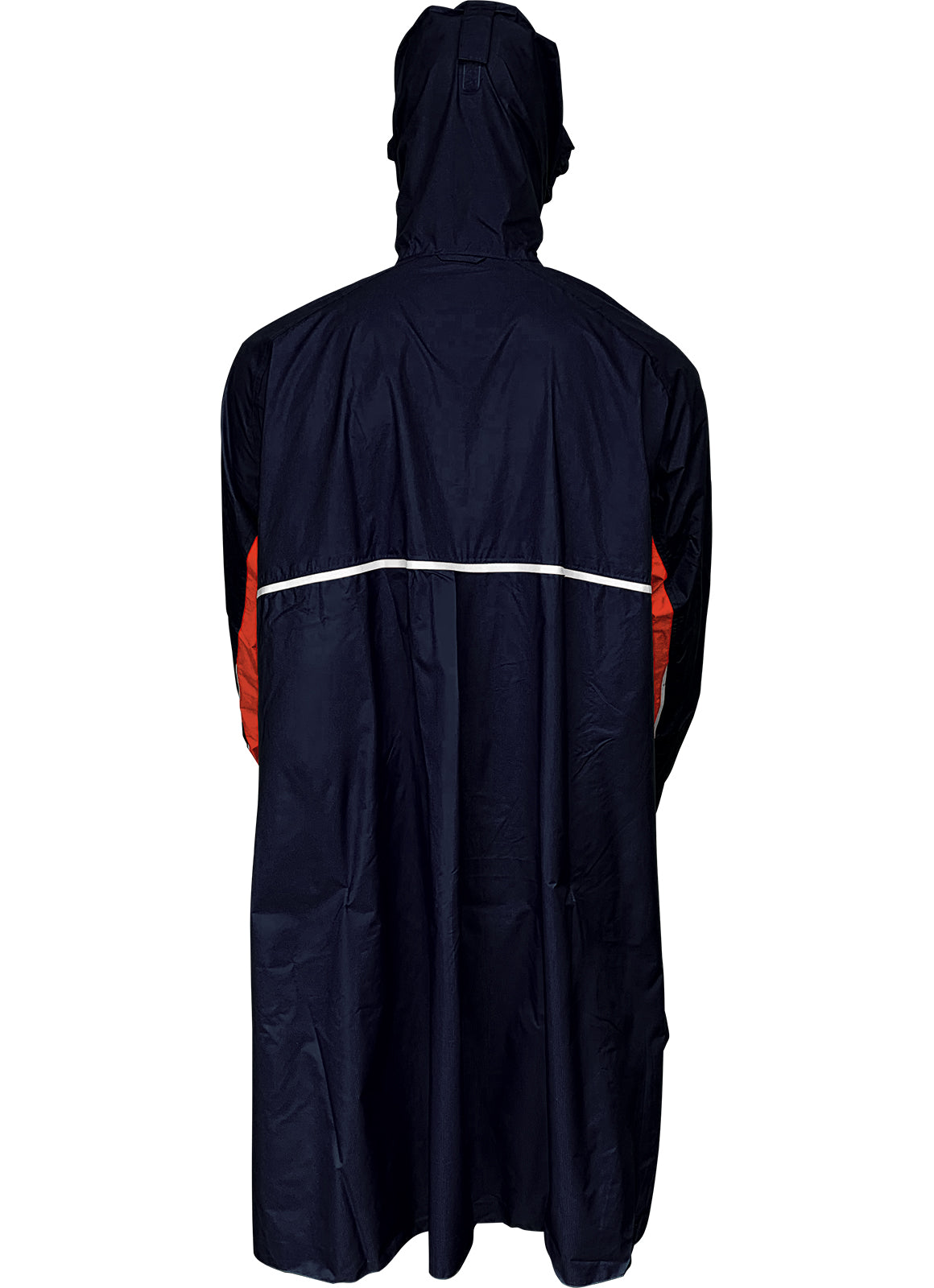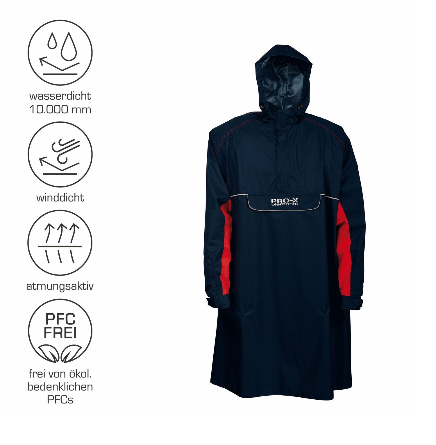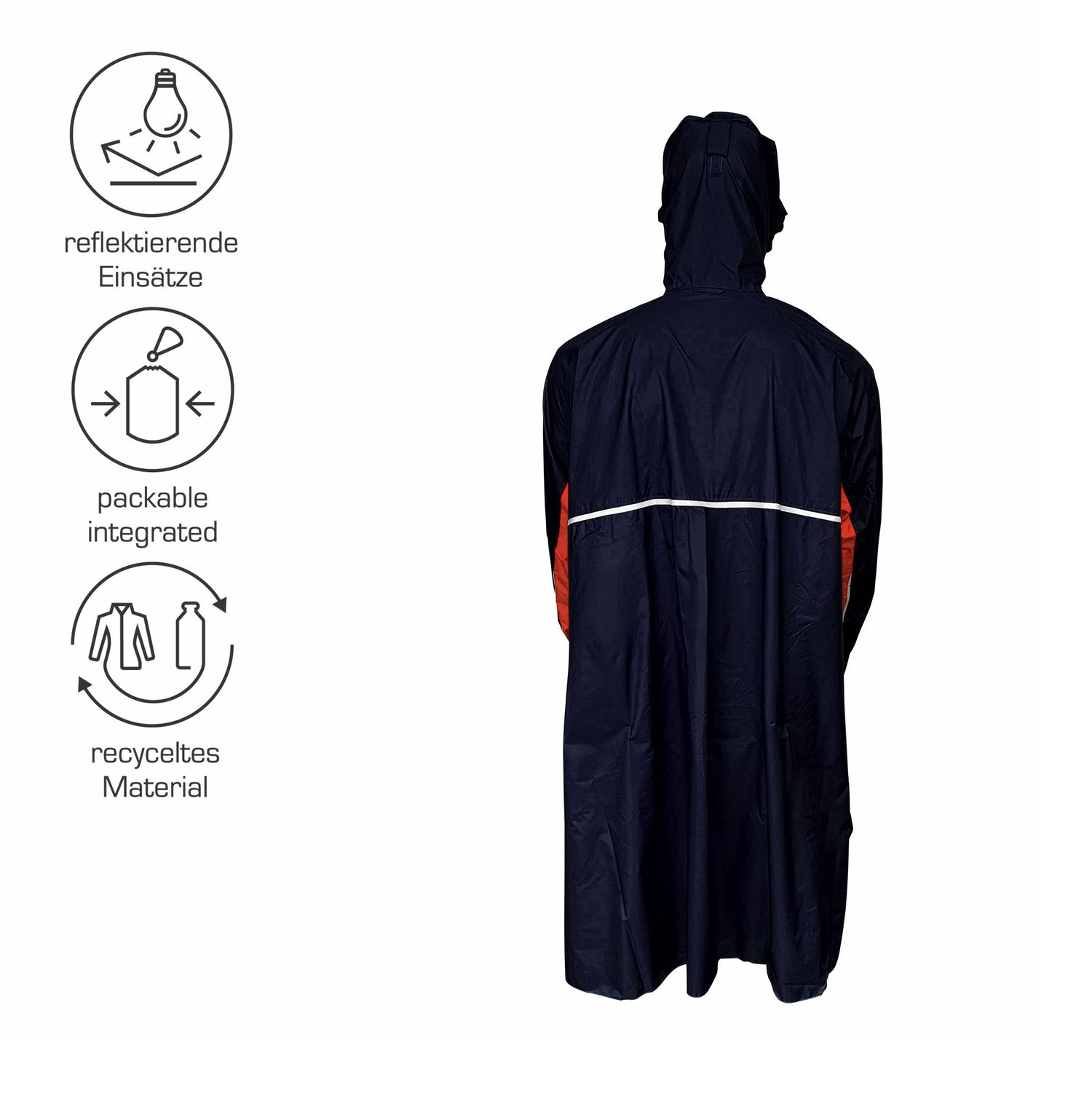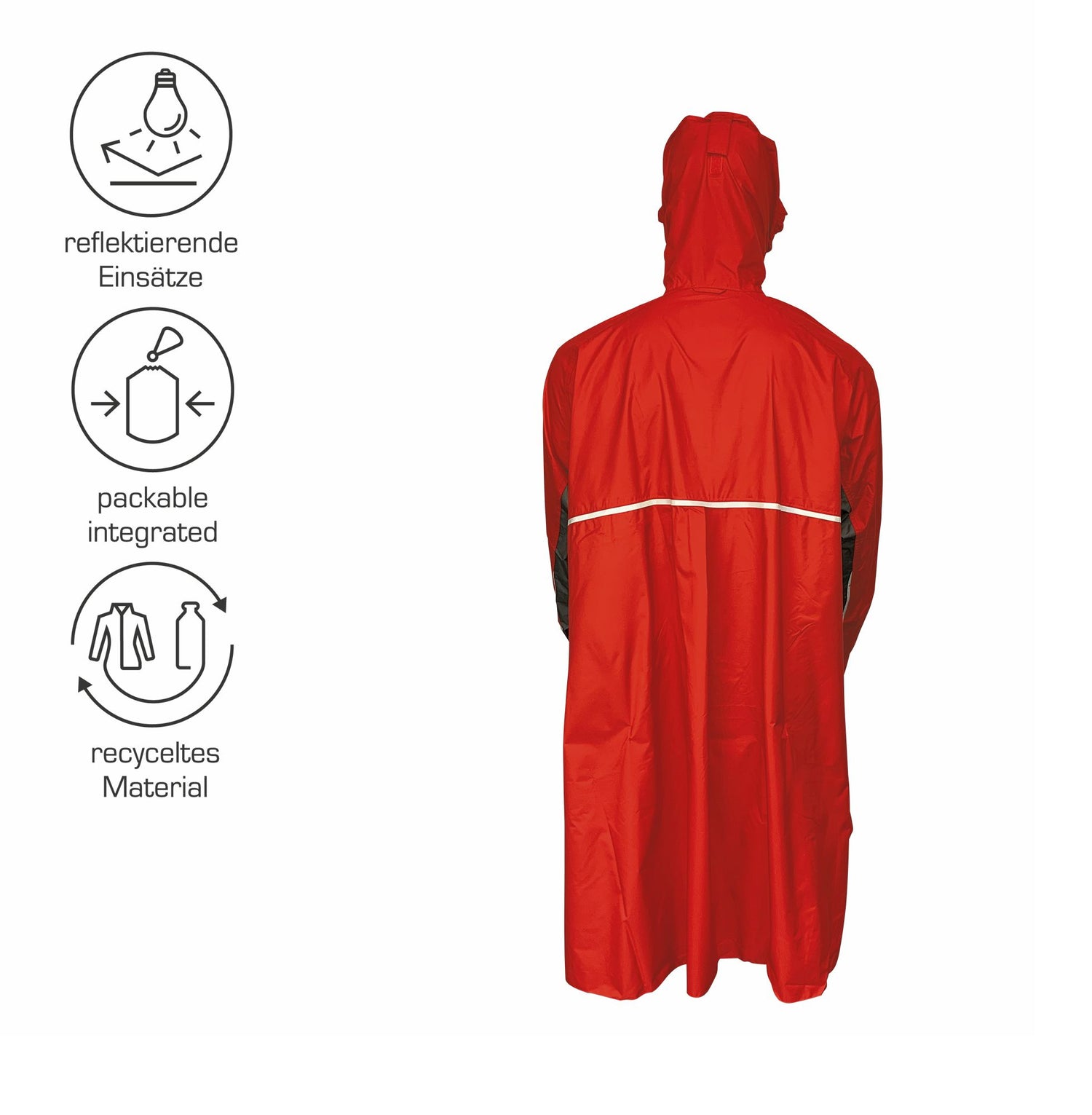 Atmungsaktiver, zweifarbiger Rad-Poncho mit Ärmeln aus PXE-PRO. Angeschnittene Schirmkapuze, mit elastischem Zug und Klettverschluss 2-fach verstellbar. Grosse Brusttasche als Gürtelpacktasche. Elastische Befestigungsbänder mit Klickverschluss zur Fixierung des Rückenteils. Handschlaufen. Armdurchgriffe. Gewicht in Gr. M/L = 460 g. Rückenlänge in Gr. M/L = 99,5 cm.